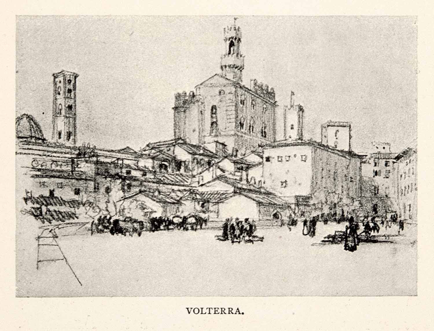 This is an original 1904 black and white halftone print of an illustration by Joseph Pennell of the ancient town of Volterra in Tuscany, Italy.