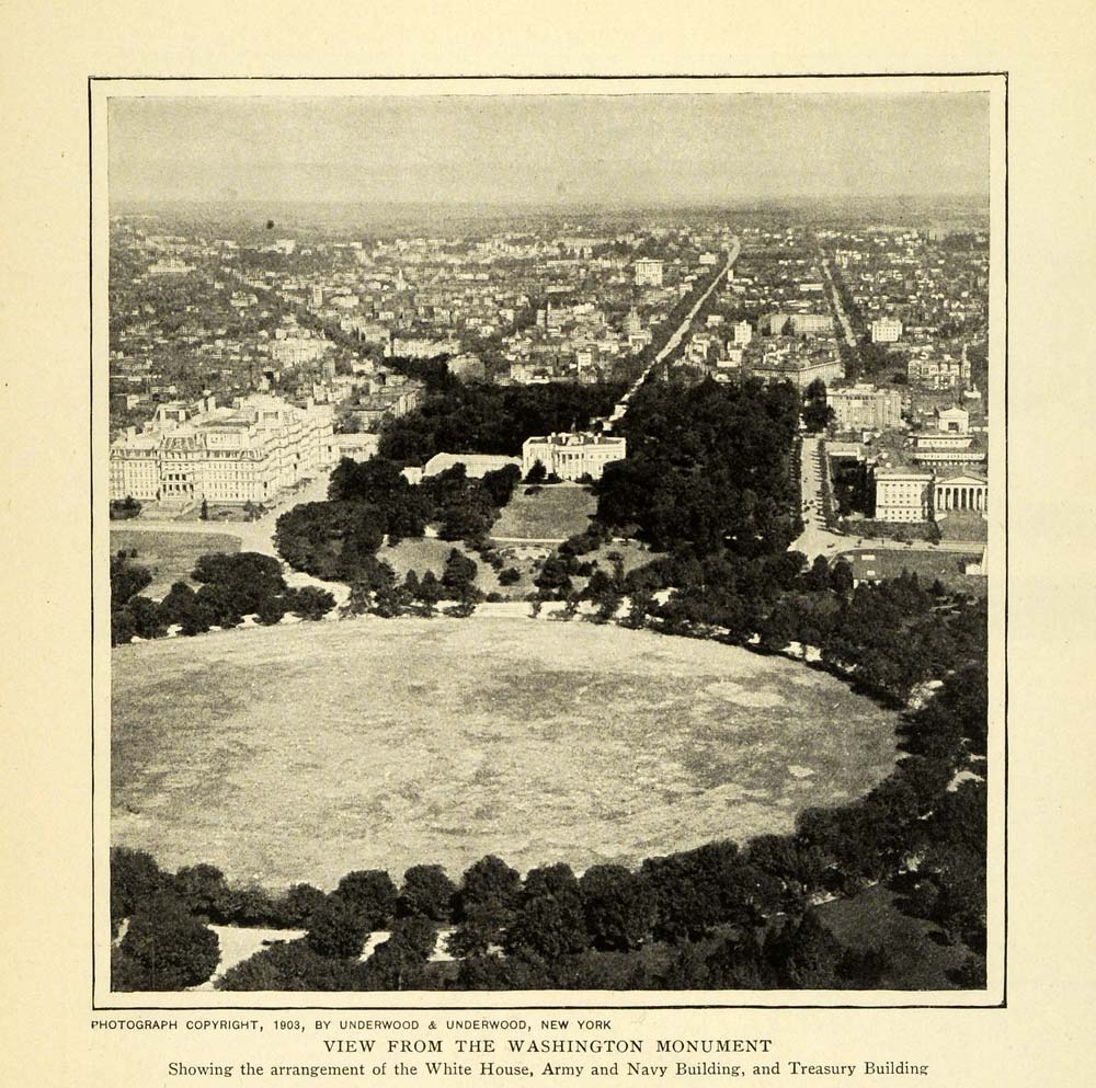 This is an excellent original 1904 halftone print of a view from the Washington Monument showing the arrangement of the White House, Army and Navy Building, and Treasury Building.