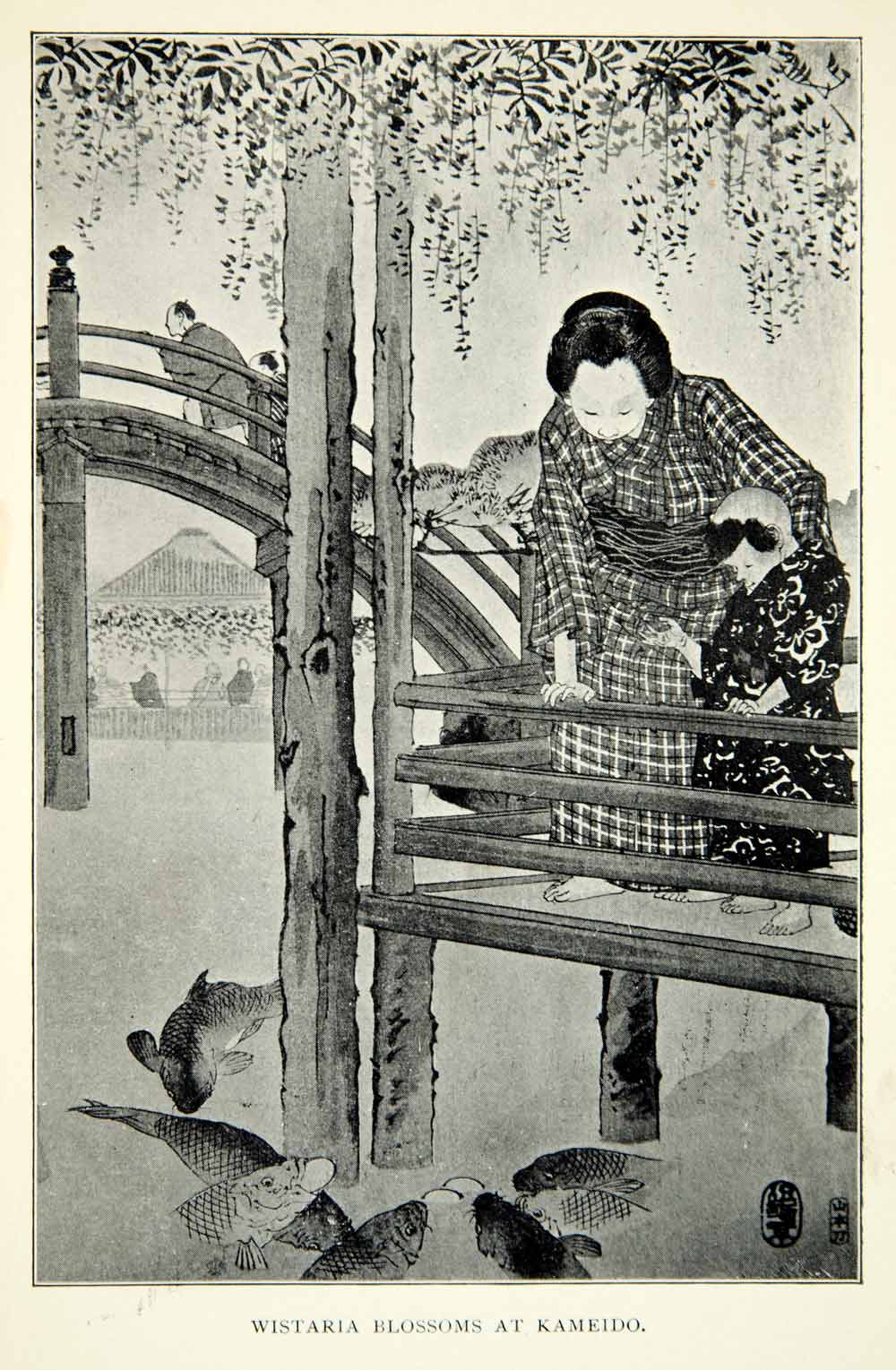 This is an original 1904 black and white halftone print of a Japanese mother and child in traditional dress watching koi fish under the fragrant wisteria blossoms.