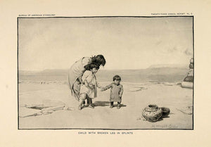This is an original 1904 halftone print of Zuni children with one child with a broken leg in a splint.