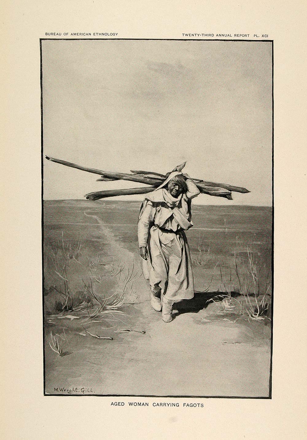 This is an original 1904 halftone print of a Zuni woman carrying firewood for kindling.