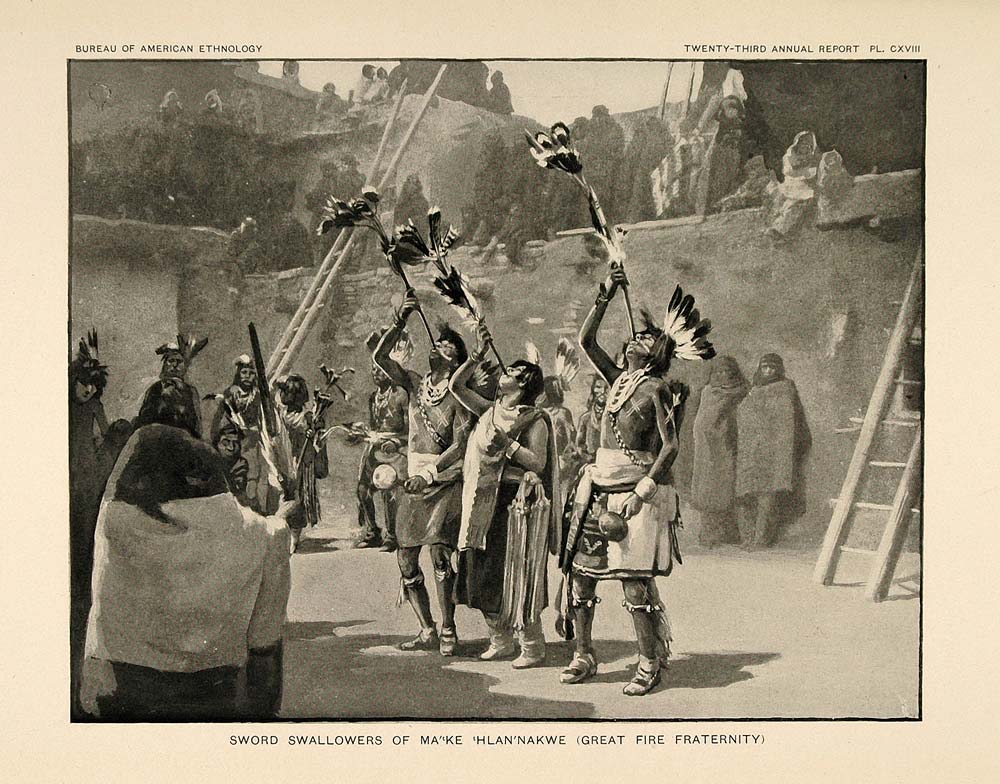 This is an original 1904 halftone print of the sword swallowers of Ma'ke Hlannakwe, the Great Fire Fraternity of the Zuni people.