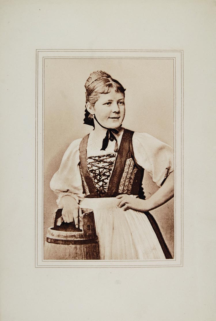 This is an original 1904 photogravure of a Swiss peasant woman dressed in her traditional costume.