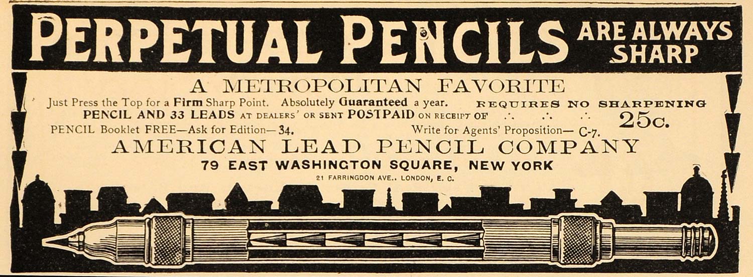 This is an original 1904 black and white print ad for Perpetual Pencils from the American Lead Pencil Company, 79 East Washington Square, NYC.