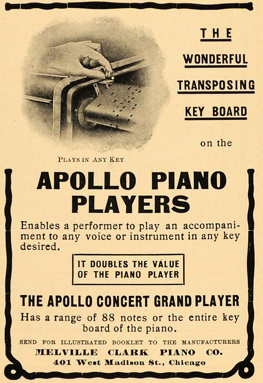 This is an original 1904 black and white print ad for the Apollo Concert Grand Player Piano with transposing key board from the Melville Clark Piano Co., 401 West Madison St., Chicago.