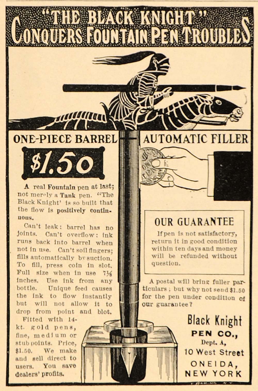 This is an original 1904 black and white print ad for Black Knight Fountain Pens from the Black Knight Pen Co., 10 West St., Oneida, NY.