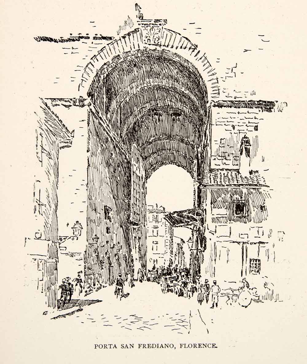 This is an original 1904 black and white in-text wood engraving of an illustration by Joseph Pennell of the Porta San Frediano in Florence, Tuscany, Italy.