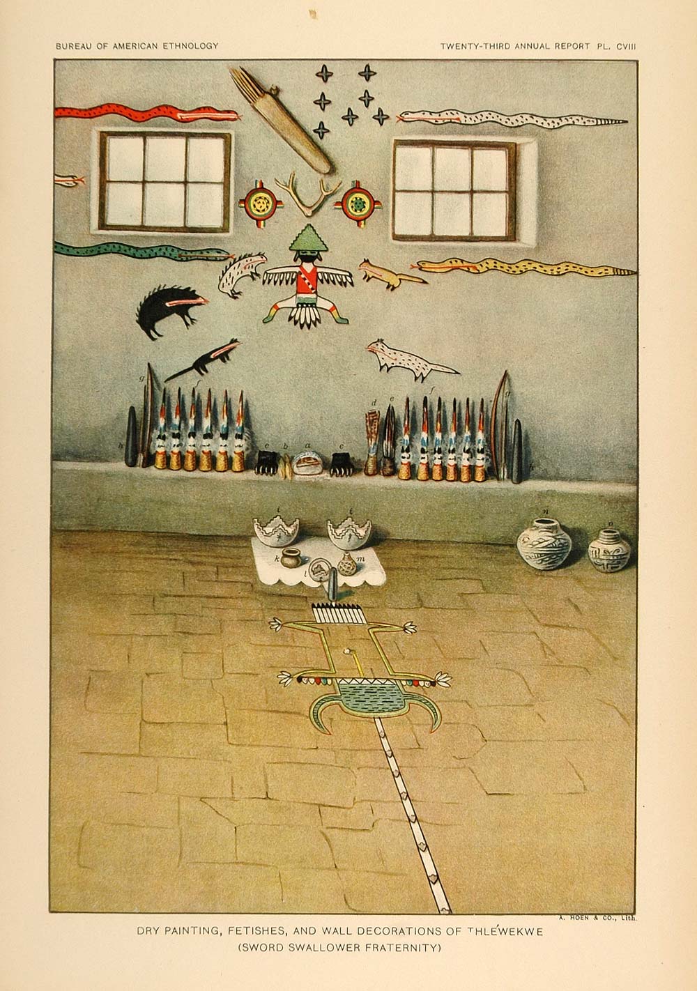 This is an original 1904 color lithograph of the dry painting, fetishes, and wall decorations of the Hlewekwe, the Sword Swallower Fraternity of the Zuni people.