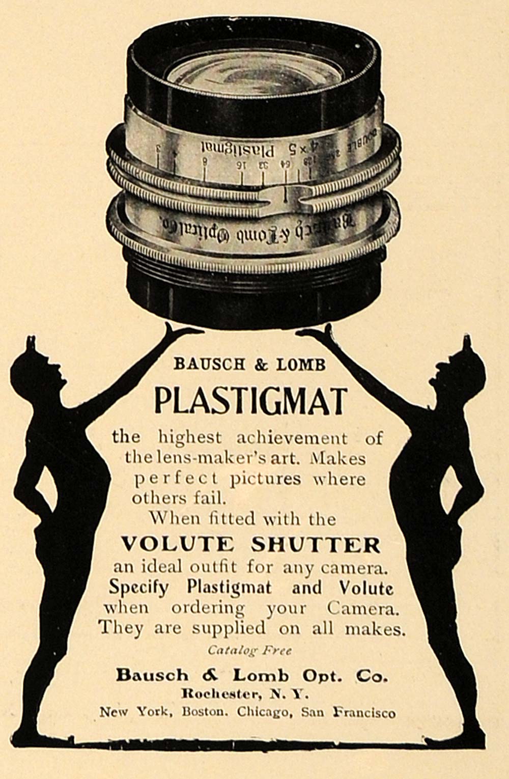 This is an original 1905 black and white print ad for the Bausch and Lomb Plastigmat and Volute Shutter for cameras by the Bausch and Lomb Opt Company located in Rochester, New York.