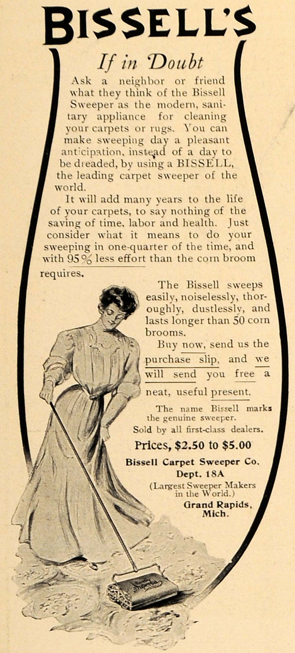 Bissell Inc. (Bissell Homecare) of Walker, Michigan, manufactures floor care products and vacuum cleaners. Melville Bissell and his wife Anna started this company after experiencing continuous problems trying to sweep sawdust from their crockery shopÕs carpet. Anna expressed her exhaustion and need for a solution to her mechanically-inclined and inventive husband, who, in turn, created the Bissell Carpet Sweeper, which he patented in 1876.