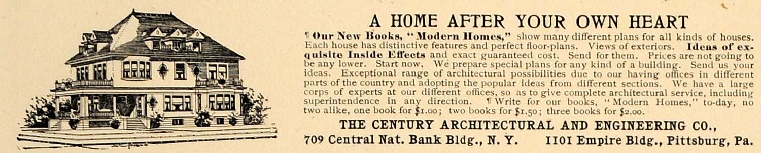 This is an original 1905 black and white print ad for The Century Architectural and Engineering Company located at 709 Central National Bank Building, New York City, New York and 1101 Empire Building, Pittsburgh, Pennsylvania.