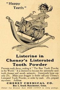 This is an original 1905 black and white print ad for Cheney's Listerated Tooth Powder by they Cheney Chemical Company located in South Manchester, Connecticut.