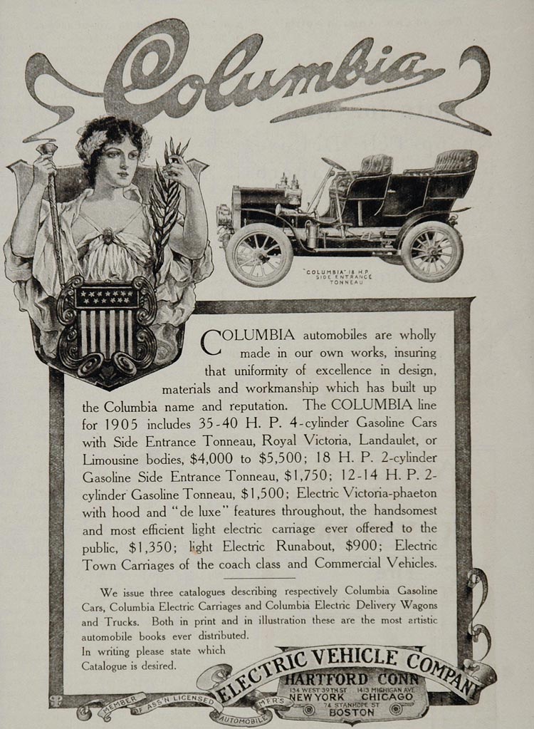 This is an original 1905 black and white print ad for Columbia automobiles from the Electric Vehicle Company, Hartford, Connecticut. Shown here is the Columbia 18 H.P. Side Entrance Tonneau.