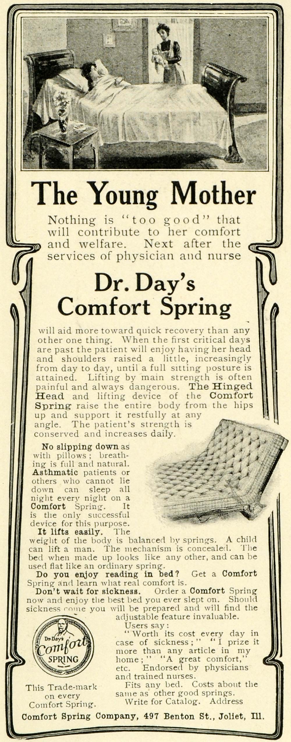 This is an original 1905 black and white print ad for the Comfort Spring Company of 497 Benton Street in Joliet, Illinois. This ad features their Dr. Day's Comfort Spring Mattresses.