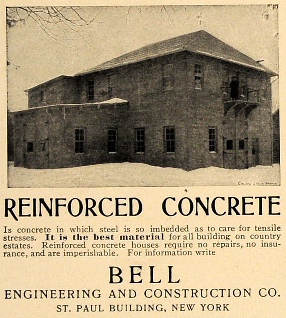 This is an original 1905 black and white print ad for reinforced concrete by Bell Engineering and Construction Company located in the St. Paul Building, New York City, New York.