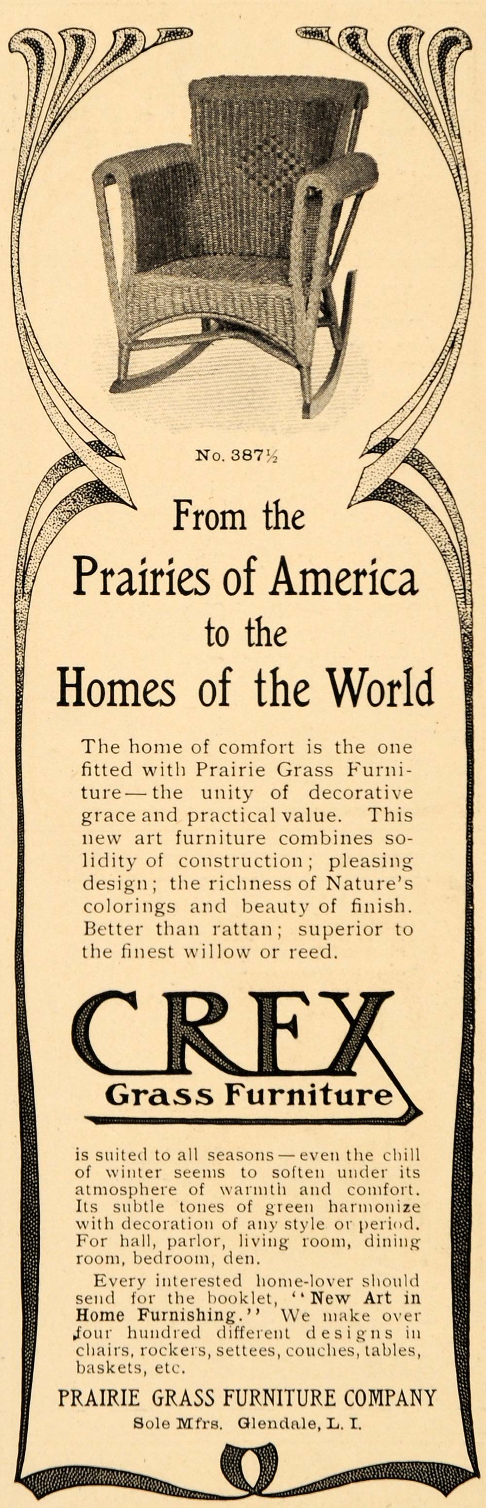 This is an original 1905 black and white print ad for Crex Grass Furniture by Prairie Grass Furniture Company, Sole Manufacturers, Glendale, L. I.