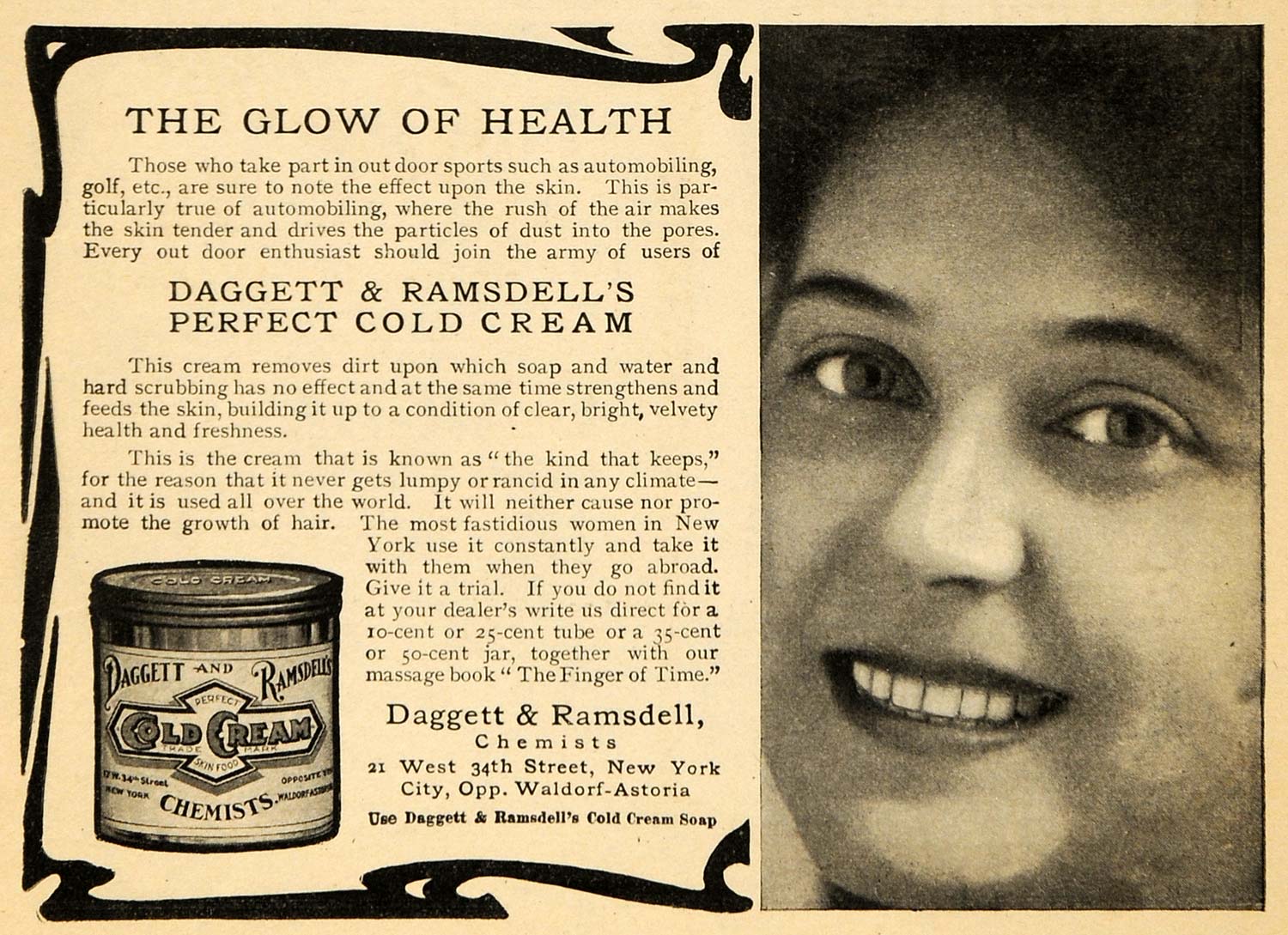 This is an original 1905 black and white print ad for Daggett & Ramsdell, chemists, located at 21 West 34th Street in New York. This ad is for their Perfect Cold Cream for the facial complexion and gives one the glow of health.