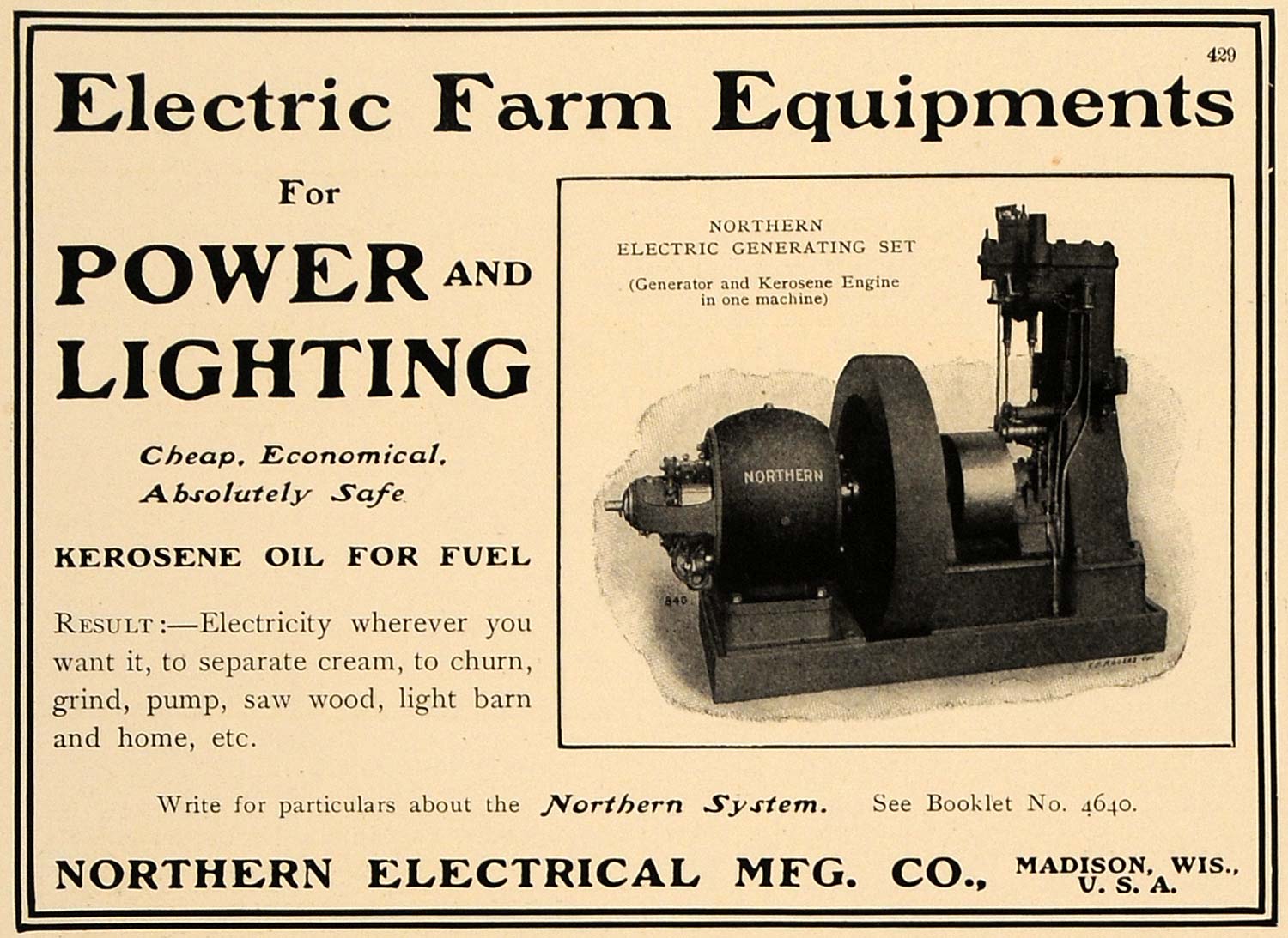 This is an original 1905 black and white print ad for electric farm equipment for power and lighting by the Northern Electrical Manufacturing Company located in Madison, Wisconsin.