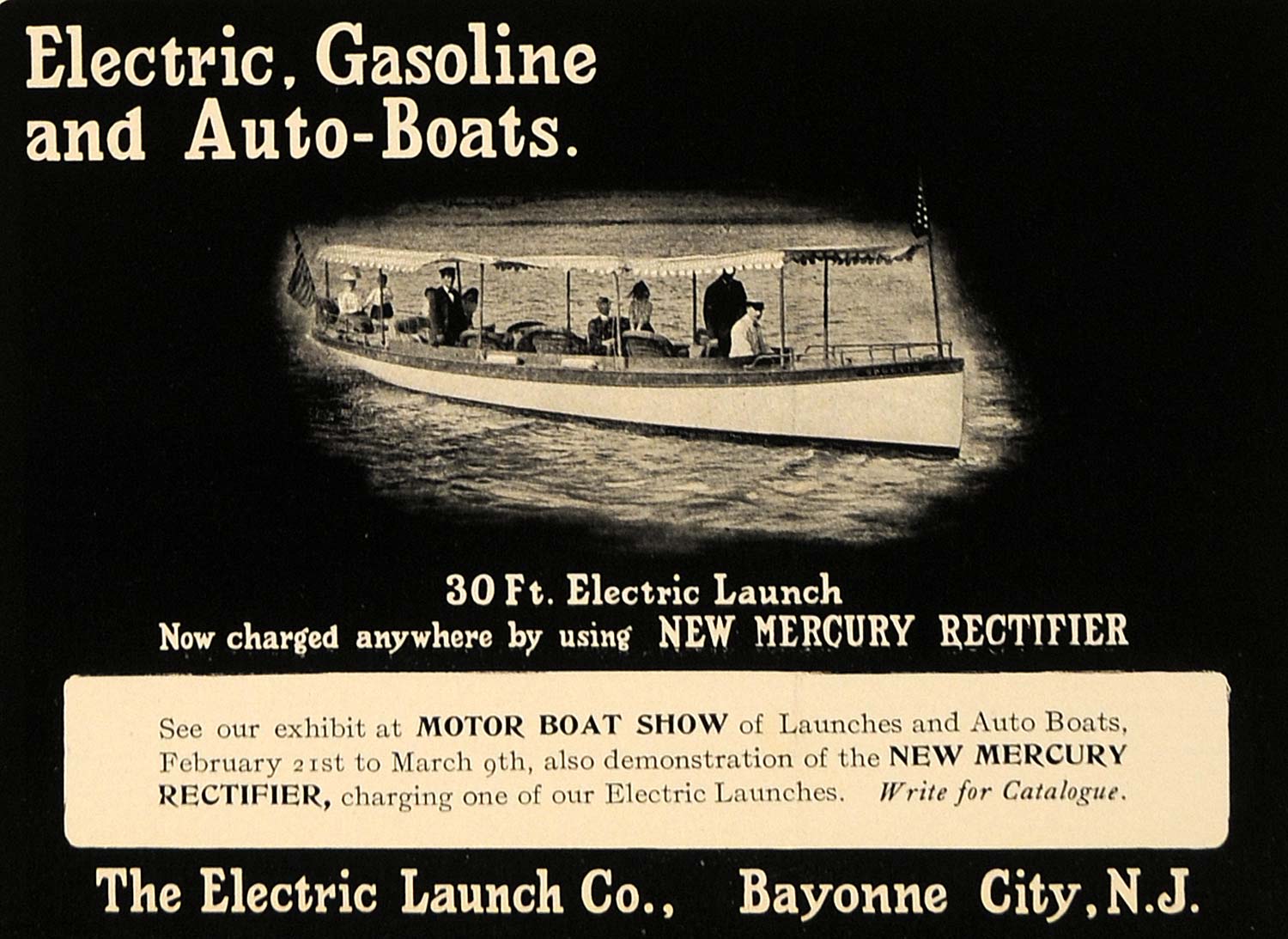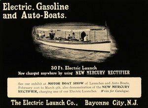 This is an original 1905 black and white print ad for Electric, Gasoline and Auto-Boats, products by The Electric Launch Company in Bayonne City, New Jersey.