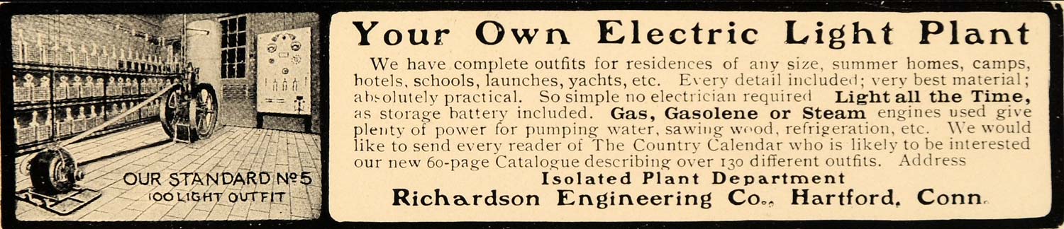 This is an original 1905 black and white print ad for your own electric light plant by the Richardson Engineering Company located in Hartford, Connecticut.