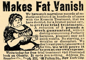 This is an original 1905 black and white print ad for the Kresslin Treatment to make fat vanish, by the Bromley Company on Fulton Street, New York City.