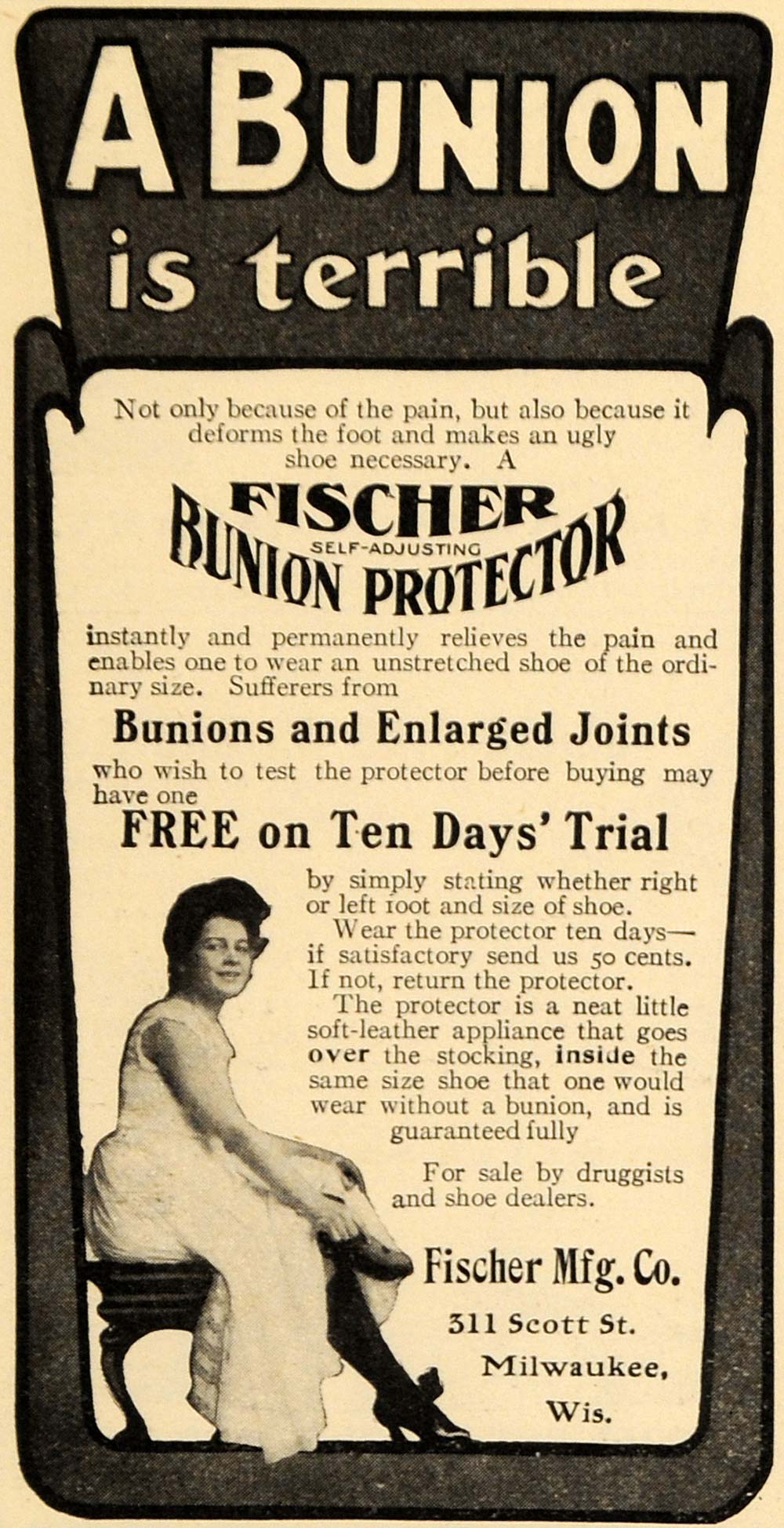 This is an original 1905 black and white print ad for the Fischer Self-Adjusting Bunion and Enlarged Joint Protector, a product by Fischer Manufacturing Company, located at 311 Scott Street in Milwaukee, Wisconsin.