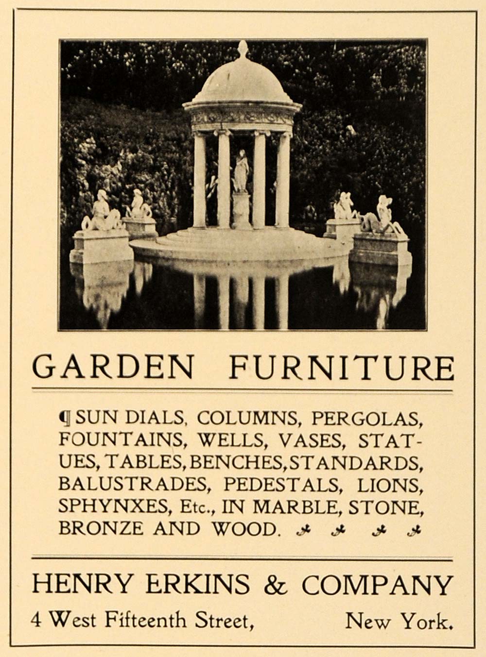 This is an original 1905 black and white print ad for sundials, columns, pergolas, fountains, wells, vases, statues, tables, benches, standards, balustrades, pedestals,lions, sphynxes and other garden furniture by Henry Erkins & Company located at 4 West Fifteenth Street, New York.