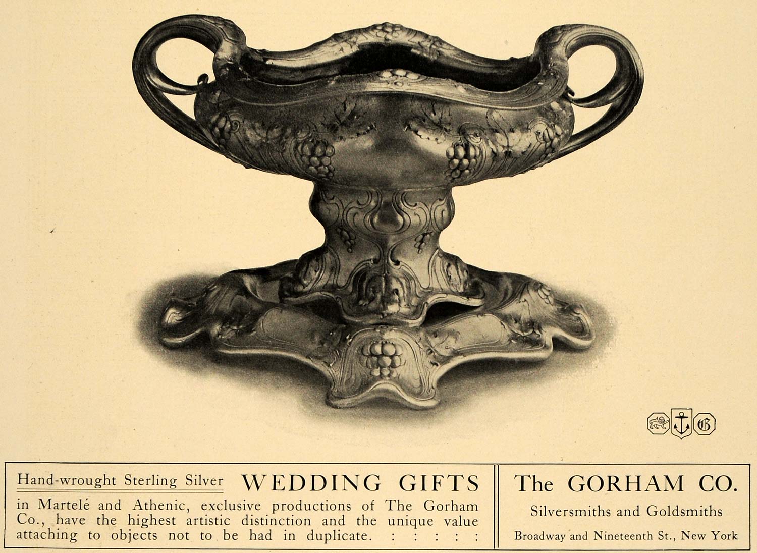 This is an original 1905 black and white print ad for hand wrought sterling silver wedding gifts by The Gorham Company located at Broadway and Nineteenth Street, New York City, New York.