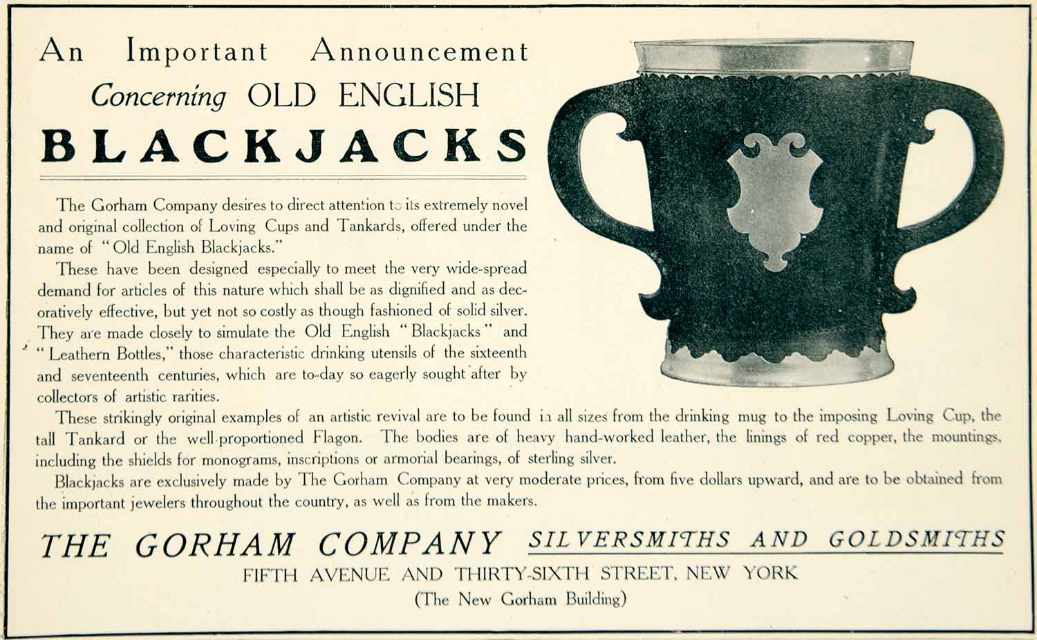 This is an original 1905 duotone print ad for Old English Blackjacks cups and tankards that were made and sold by the Gorham Company of Fifth Avenue and 36th Street, New York, NY.