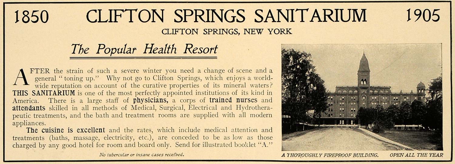 This is an original 1905 black and white print ad for Clifton Springs Sanitarium in Clifton Springs, New York. The Five-Story L-Shaped brick Sanitarium with architecture modeled after the Richardsonian Romanesque style was built around 1892. Dr. Henry Foster, the central character to the Sanitarium, dreamt of God speaking to him and instructing him to build a Sanitarium centered around God, where prayer would rule over medical treatment.