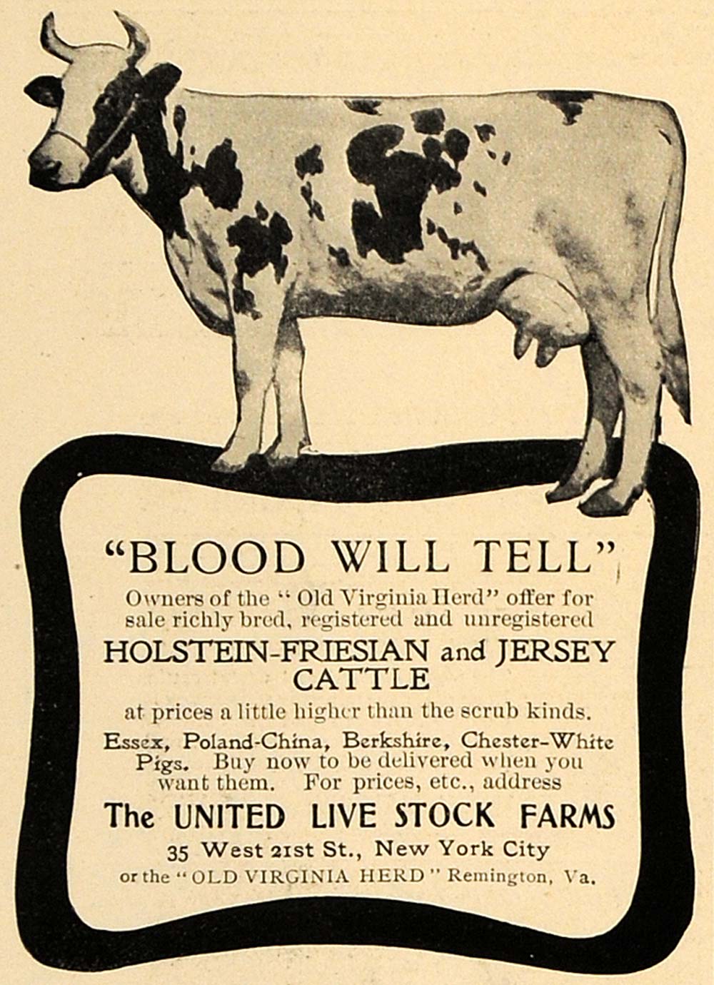 This is an original 1905 black and white print ad for Holstein-Friesian and Jersey Cattle by The United Live Stock Farms located at 35 West 21st Street, New York City, New York.
