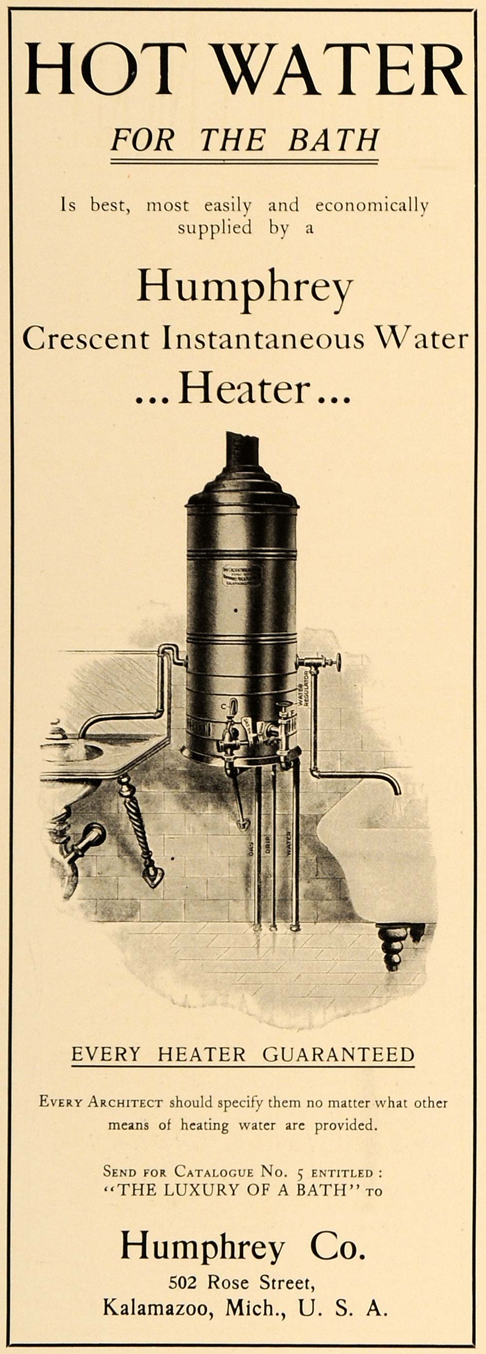 This is an original 1905 black and white print ad for Humphrey Crescent Instantaneous Water Heater by the Humphrey Company located at 502 Rose Street, Kalamazoo, Michigan.
