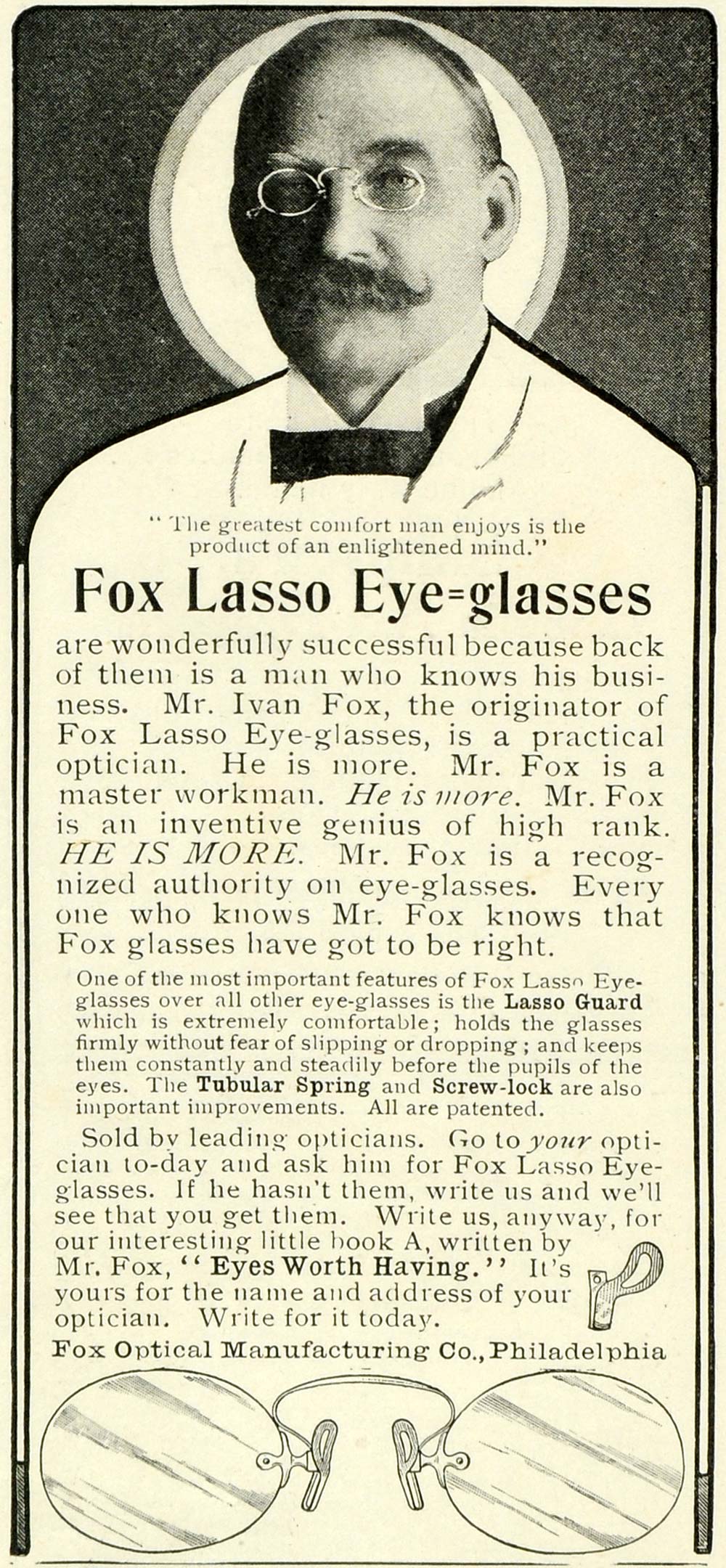 This is an original 1905 black and white print ad for the Fox Optical Manufacturing Company of Philadelphia, Pennsylvania. This ad features their Fox Lasso Eyeglasses and spectacles.