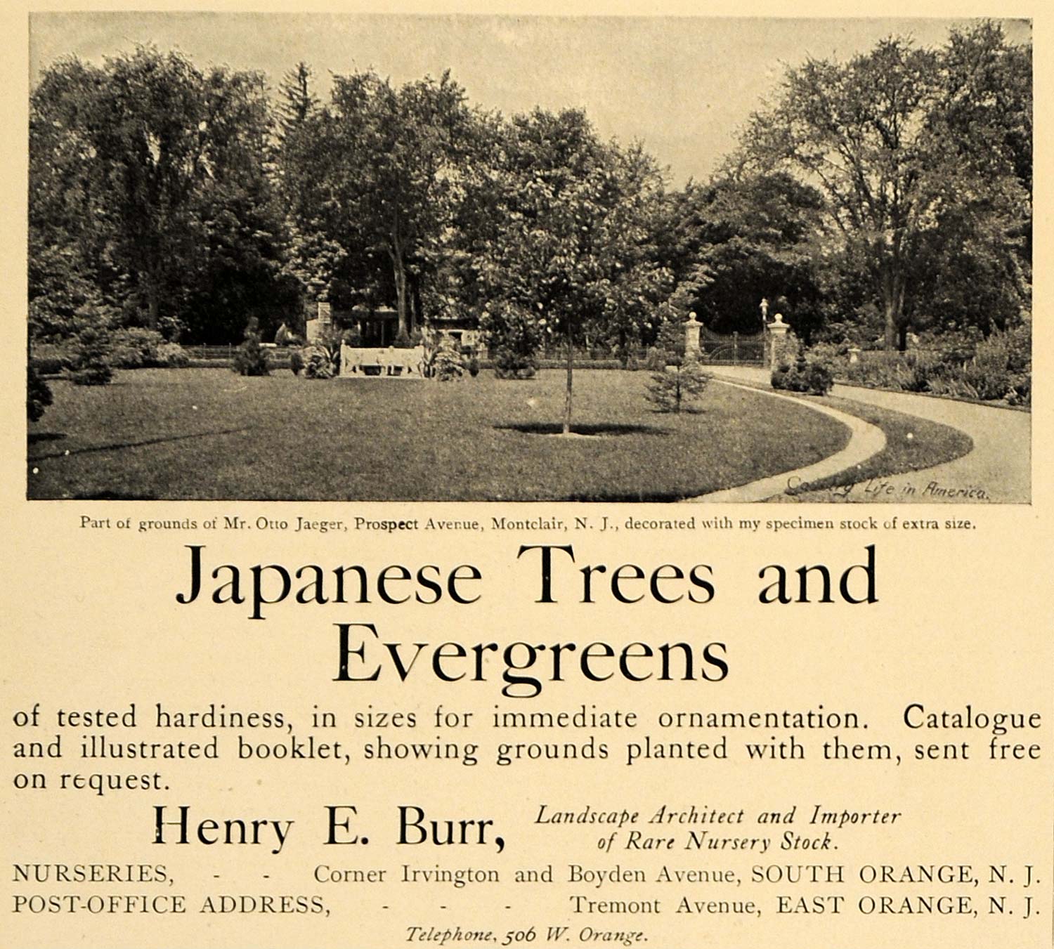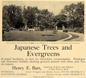 This is an original 1905 black and white print ad for Japenese Trees and Evergreens from Henry E. Burr, Landscape Architect and Importer of Rare Nursery Stock.
