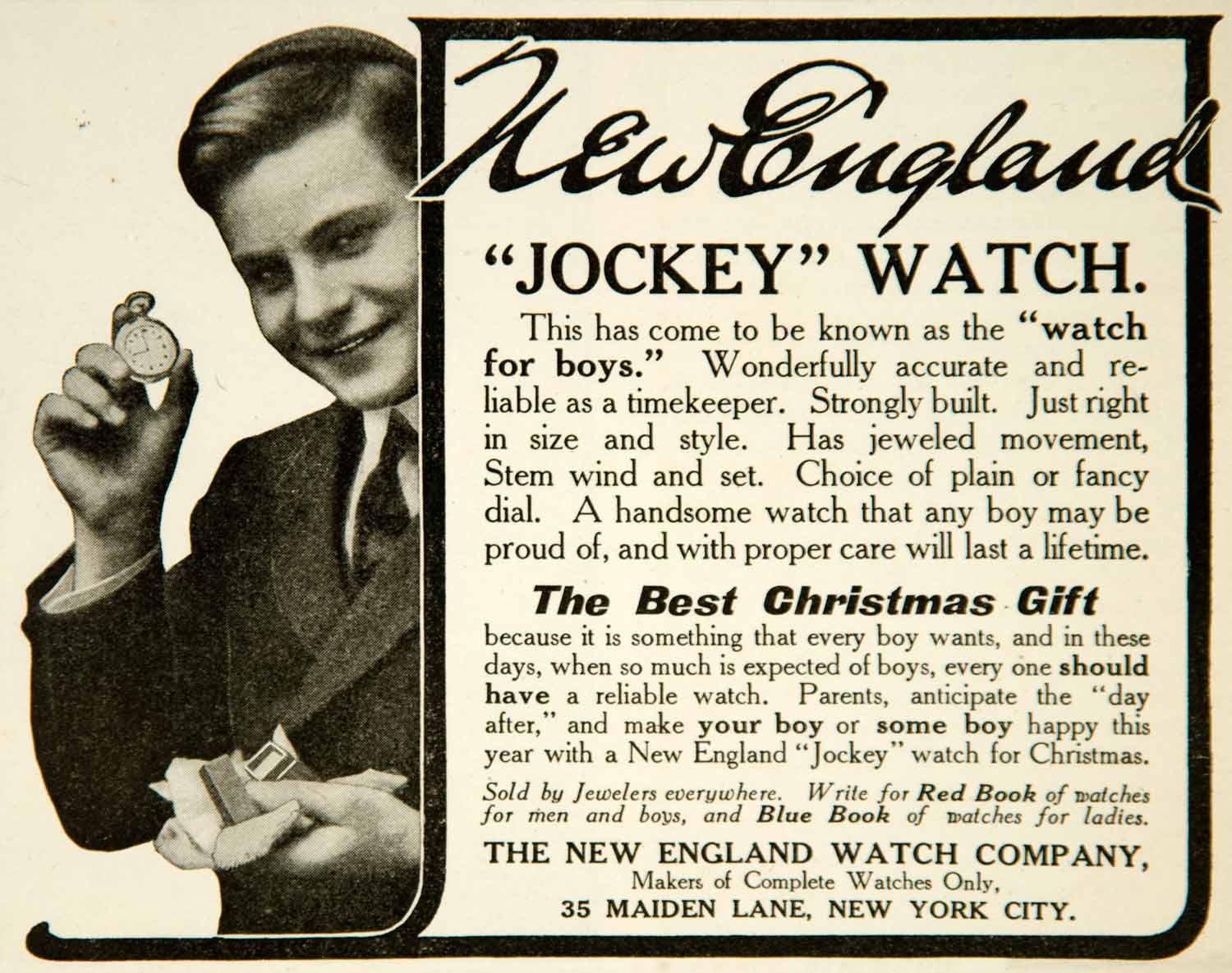 This is an original 1905 black and white print ad for the "Jockey" Watch, from the New England Watch Company located at 35 Maiden Lane, New York City.