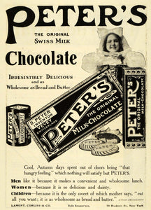 This is an original 1905 black and white print ad for the Peter's Milk-Chocolate cookies from Lamont, Corliss and Company located at 78 Hudson Street, New York.