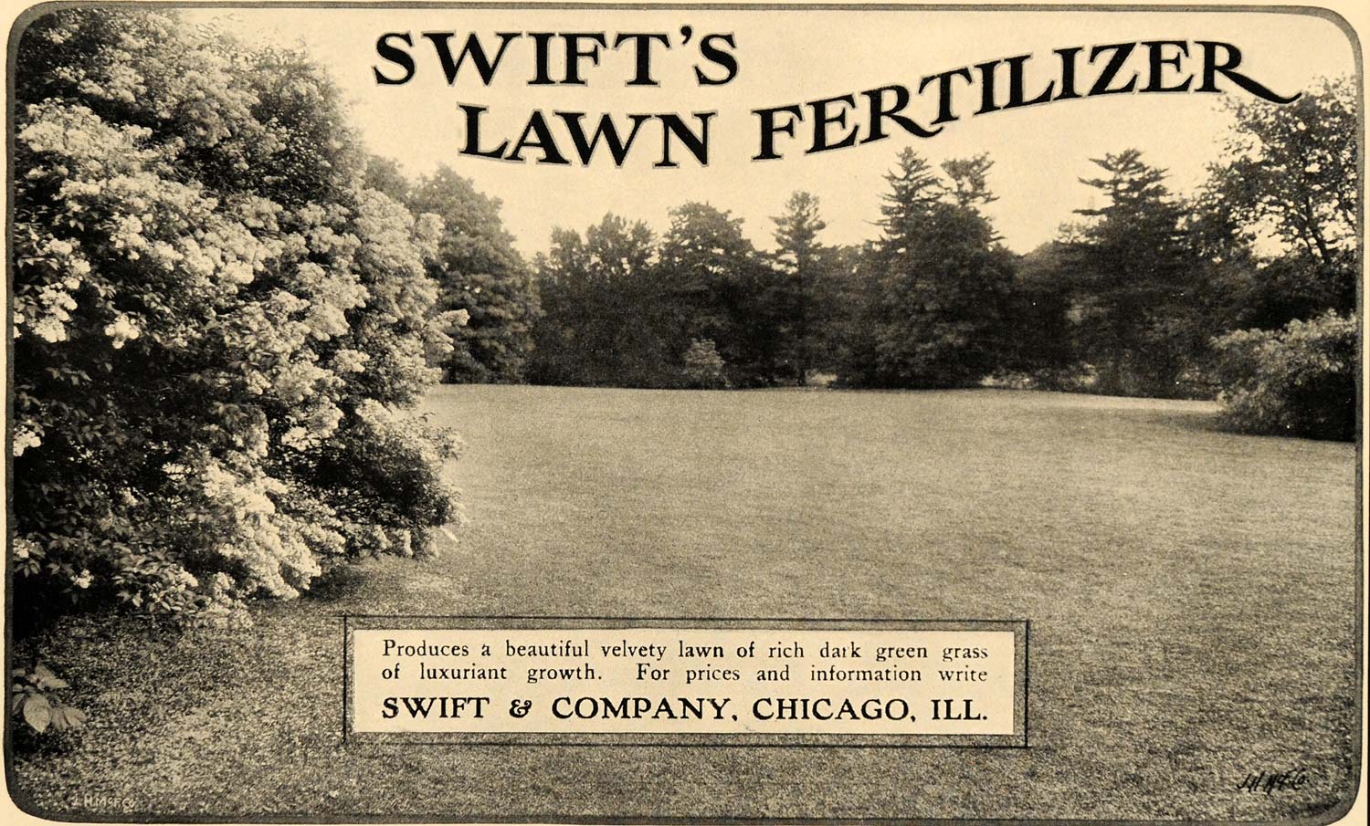 This is an original 1905 black and white print ad for Swift's Lawn Fertilizer by Swift & Company, located in Chicago, Illinois.