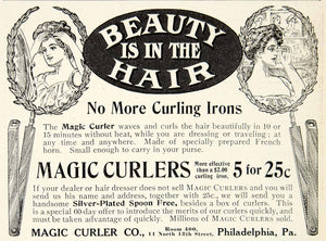 This is an original 1905 black and white print ad for Magic Curlers brand that was made by the Magic Curler Company and was meant to replace traditional curling irons.