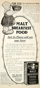 This is an original 1905 black and white print ad for the Malt Breakfast Food brand that was made by the Malted Cereals Company of Burlington, VT.