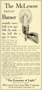 This is a small original 1905 black and white print ad for the McLewee Gas Lamp Manufacturing Company of 816 Drexel Building in Philadelphia, Pennsylvania. This ad features their McLewee Burner Light Bulbs.