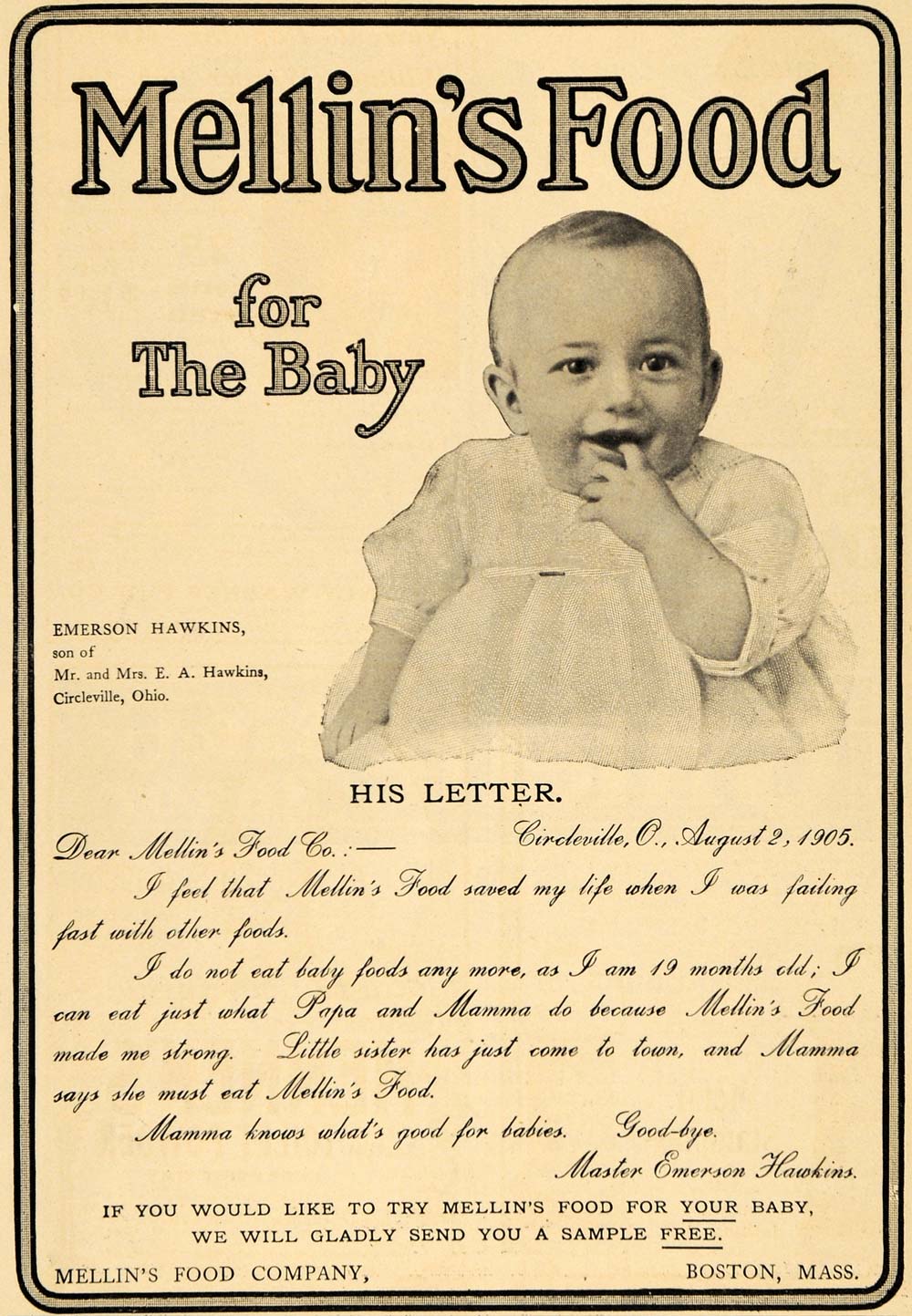 Mellin's Baby Food. Considering the difficulties some mothers had with breast-feeding, the fact that some infants could not properly digest fresh cowÕs milk, the time consuming burden of preparing and producing homemade baby food, as well as sanitation concerns surrounding infant mortality due to infected or sour milk, G. Mellin of London decided to join the few other companies that produced food for infants. However, unlike the others, Mellin created a food for babies and infants that needed very little preparation. MellinÕs Food was already boiled and strained and only needed a small amount of hot water and milk before it could be consumed. Theodore Metcalf & Company, located at 39 Tremont Street in Boston, Massachusetts, became the primary British and United States agents for MellinÕs Food. Between 1884 and 1906, Doliber-Goodale Company, located at 41 Central Wharf in Boston, Massachusetts, joined as an additional selling agent for MellinÕs Food.