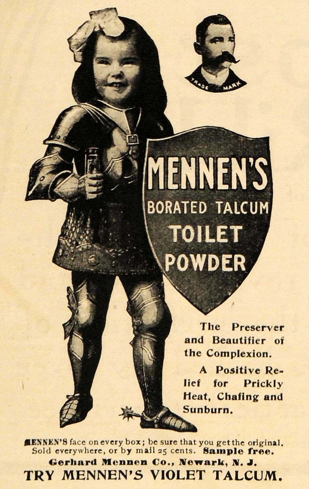 This is an original 1905 black and white print ad for the Mennen's Borated Talcum Toilet Powders promoting the Mennenls Violet Talcum from
