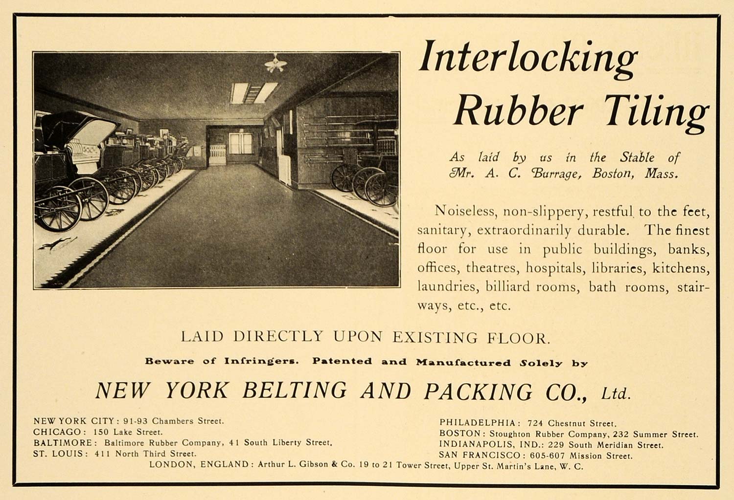 This is an original 1905 black and white print ad for interlocking rubber tiling by the New York Belting and Packing Company, Ltd. This ad has a picture of Mr. A. C. Burrage's stable in Boston, Massachusetts.