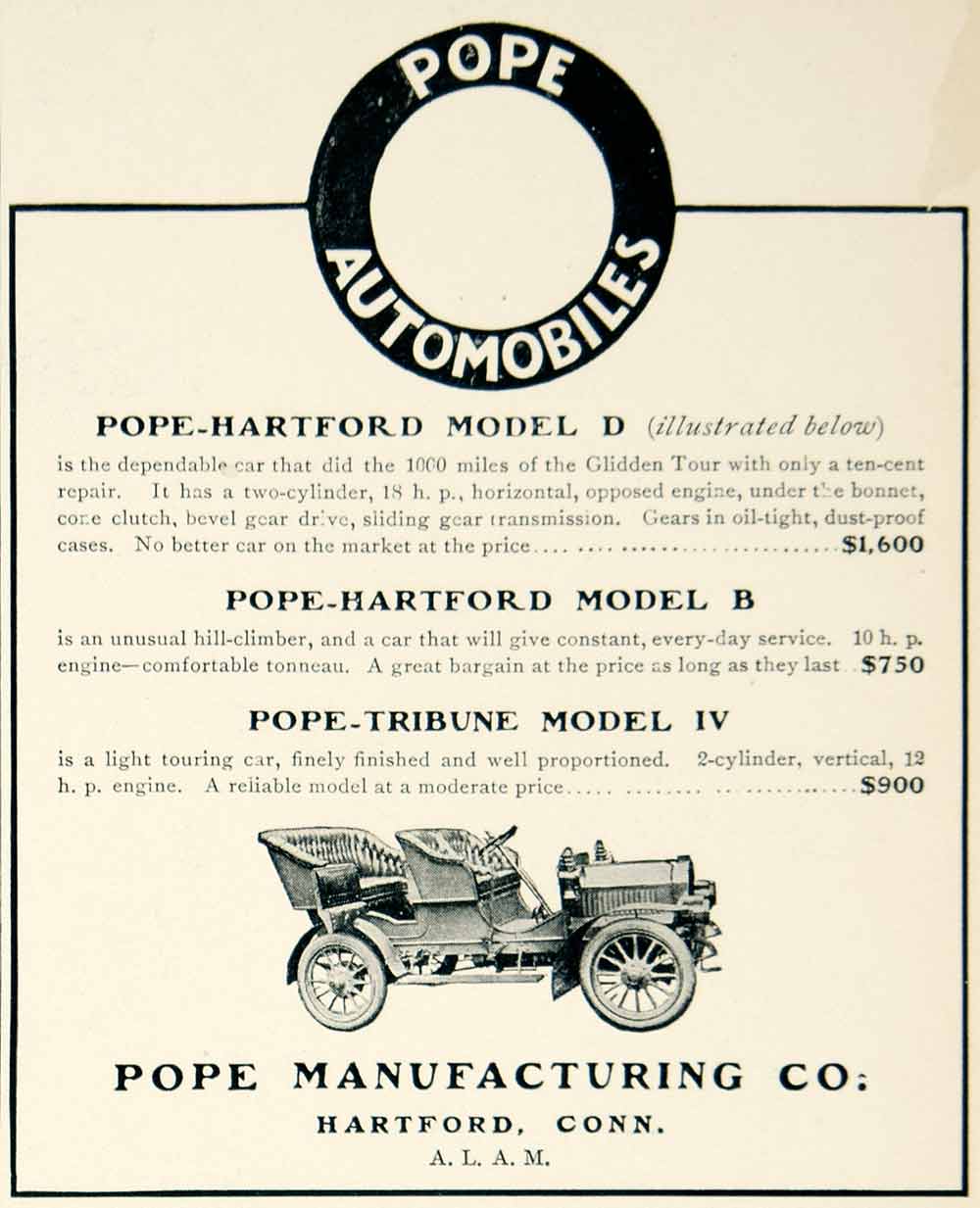 This is an original 1905 black and white print ad for the Model D, Model B, and Model IV automobiles that were made and sold by the Pope Manufacturing Company of Hartford, Connecticut (CT).