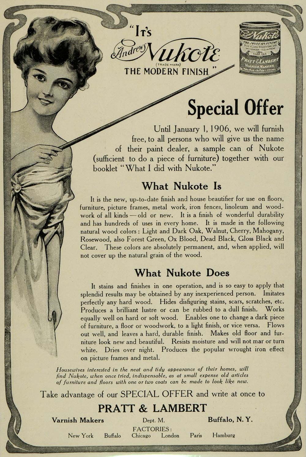 This is an original 1905 black and white print ad for Pratt & Lambert, varnish makers, of Buffalo, New York, as well as Buffalo, Chicago, London, Paris, and Hamburg. This ad features their Andrew's Nukote Modern Finish for wood and furniture.