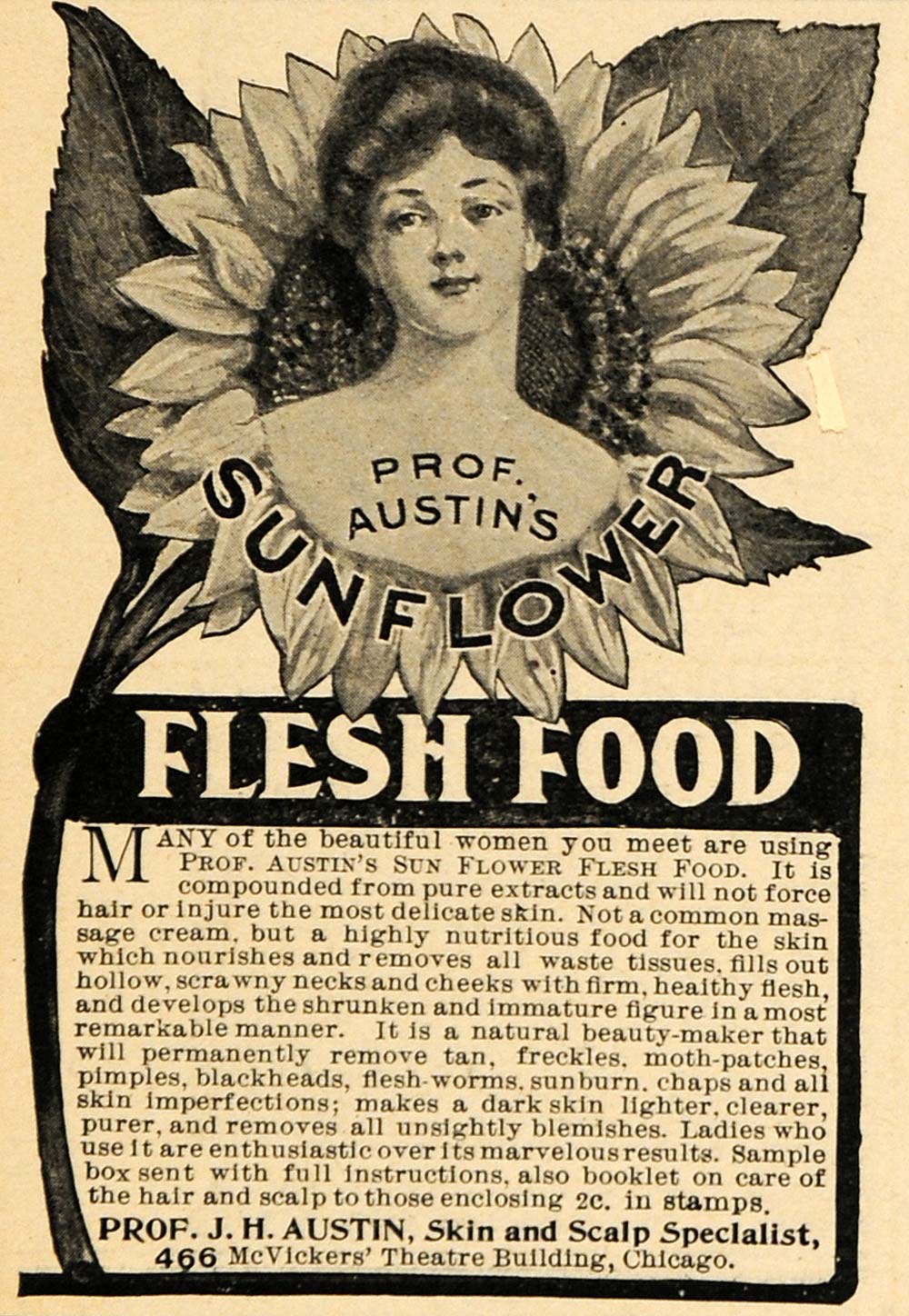 This is a small original 1905 black and white print ad for the Prof. Austin's Sunflower Flesh Food, a skin treatment from Prof. J. H. Austin, Skin and Scalp Specialist located in Chicago, Illinois.