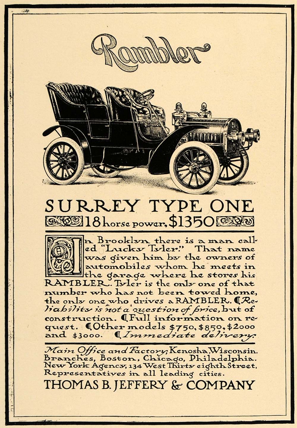 This is an original 1905 black and white print ad for the Rambler Surrey Type One automobile by Thomas B. Jefferey and Company located in Kenosha, Wisconsin.