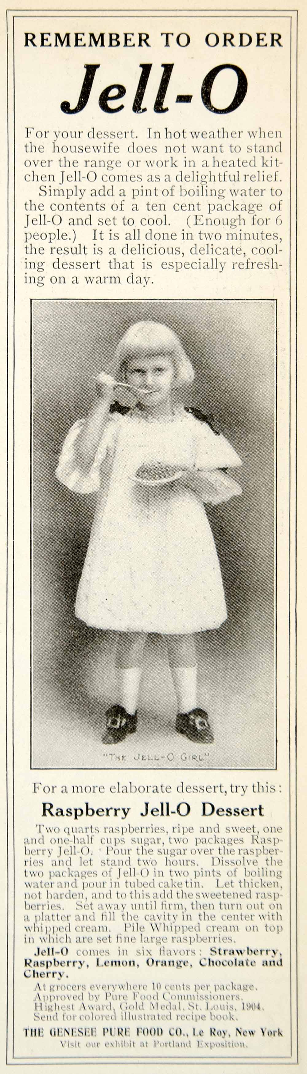This is an original 1905 black and white print ad for Jell-O brand dessert that was made by the Genesee Pure Food Company.