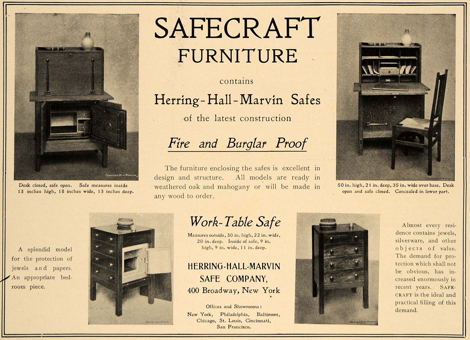 This is an original 1905 black and white print ad for Safecraft Furniture, a product of Herring-Hall-Marvin Safe Company, located at 400 Broadway in New York.