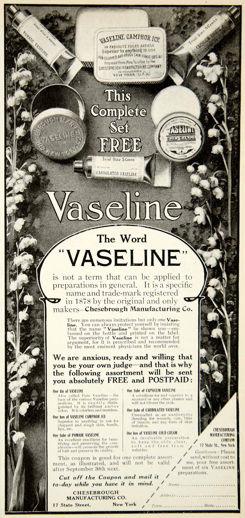 This is an original 1905 black and white print ad for several Vaseline brand products that were made by the Chesebrough Manufacturing Company.